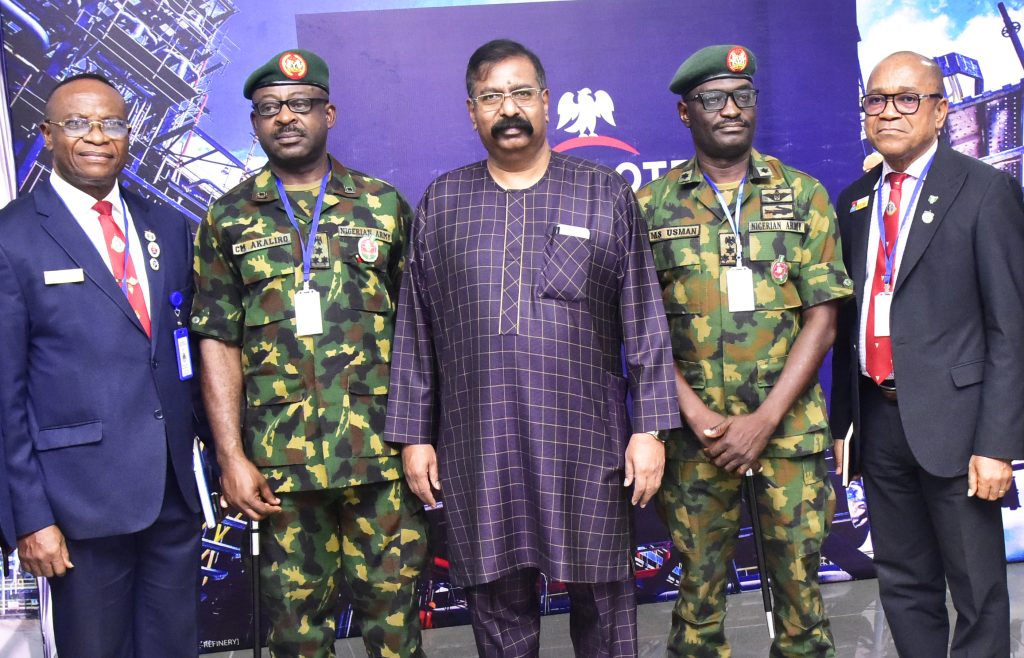 L-R: Member of Faculty, National Defence College, Air Vice Marshal, Emmanuel Chukwu; Team Coordinator, National Defence College, Brig. Gen. Chukwuemeka Michael Akaliro; Vice President, Oil and Gas, Dangote Industries Limited, Devakumar Edwin; Team Leader, National Defence College, Brig. Gen. Muhammed Sani Usman; Member of Faculty, National Defence College, Dr. Chinedu Udeh; Member of Faculty, National Defence College, Brig. Gen. Emere Edwin Chukwumezie, during the National Defence College, Course 33 visit to Dangote Petroleum Refinery and Fertiliser Plant, Lekki Lagos on Tuesday, December 3, 2024