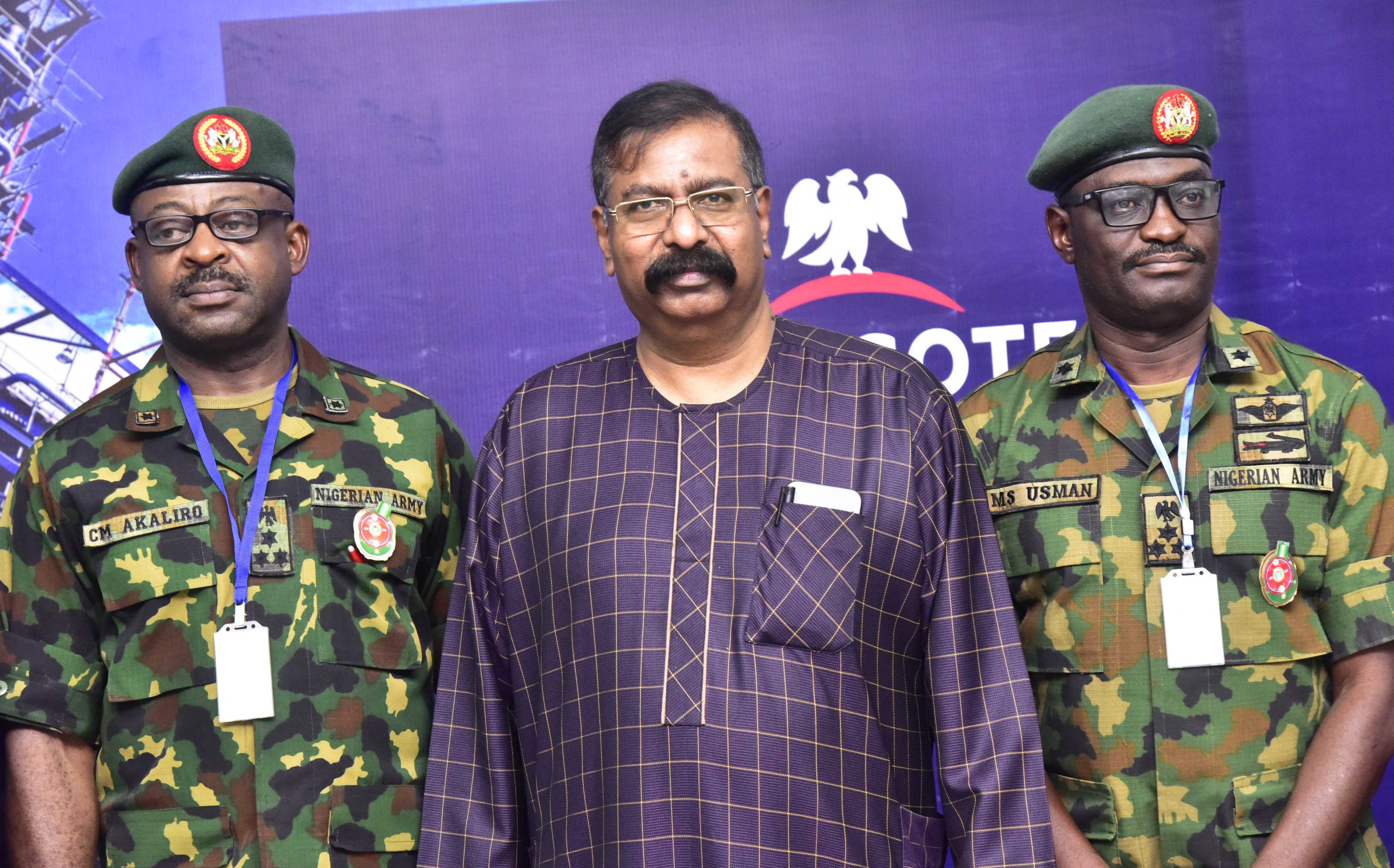 L-R: Team Coordinator, National Defence College, Brig. Gen. Chukwuemeka Michael Akaliro; Vice President, Oil and Gas, Dangote Industries Limited, Devakumar Edwin; Team Leader, National Defence College, Brig. Gen. Muhammed Sani Usman, during the National Defence College, Course 33 visit to Dangote Petroleum Refinery and Fertiliser Plant, Lekki Lagos on Tuesday, December 3, 2024